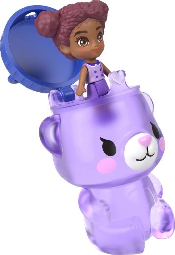 De schattige compacte set Polly Pocket Bosbessenbeertjes brengt een zakformaat wereld vol fantasie, interactieve elementen en draagbaar speelplezier. Binnenin vind je een minipoppetje, een beertje en thematische accessoires – draaibare stoeltjes, een ritje in een “fles” en een openende koelkast. Dankzij de praktische clip en het kleine opbergdoosje voor het figuurtje nemen kinderen hun miniwereld overal mee naartoe.