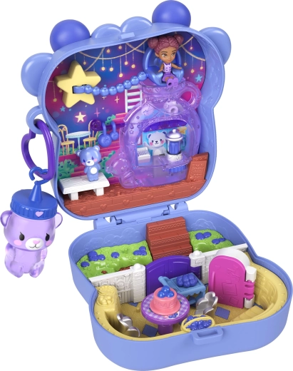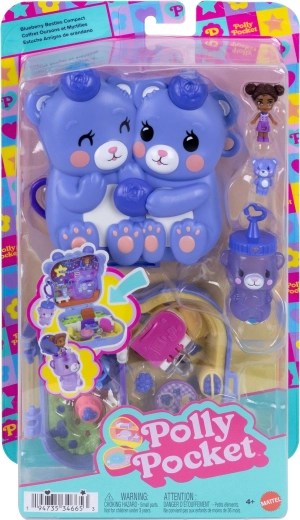 Ontdek de magie van spelen in zakformaat met de Polly Pocket Bosbessenbeertjes compact. Het schattige berenetui opent naar een miniatuurscène vol details die creatieve verhalen en fijne motoriek stimuleren. Kinderen kunnen de stoeltjes draaien, de beertjes “voeren” en de verrassingen in de koelkast ontdekken.