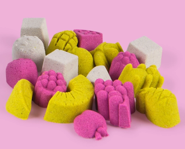 Het hoogwaardige zand neemt de details van de vormen perfect over, zodat kinderen eenvoudig vormen, glazuren en accessoires maken. Het spel stimuleert rollenspellen (banketbakkerij, keuken, ijssalon), fijne motoriek en zintuiglijke waarneming.