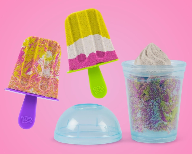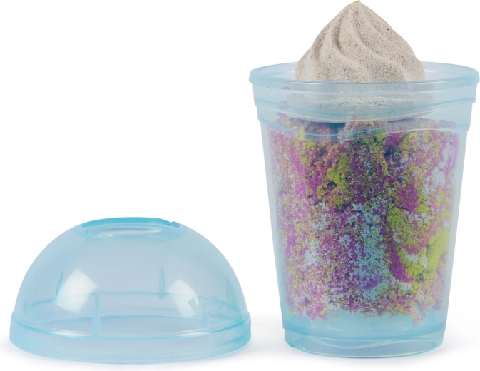 Met de Kinetic Sand smoothie-mixer leren kinderen kleuren mengen en “drankjes” en “desserts” in bekers of ijslollyvormpjes te lagen. Giet het zand in het deksel van de mixer, draai met de hand en zie hoe nieuwe tinten en realistische texturen ontstaan. Het kinetische zand voelt aan als nat, maar de handen blijven droog en het werkvlak schoner.