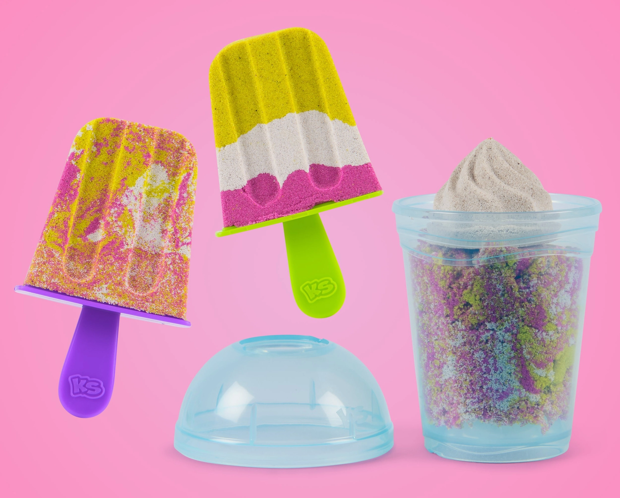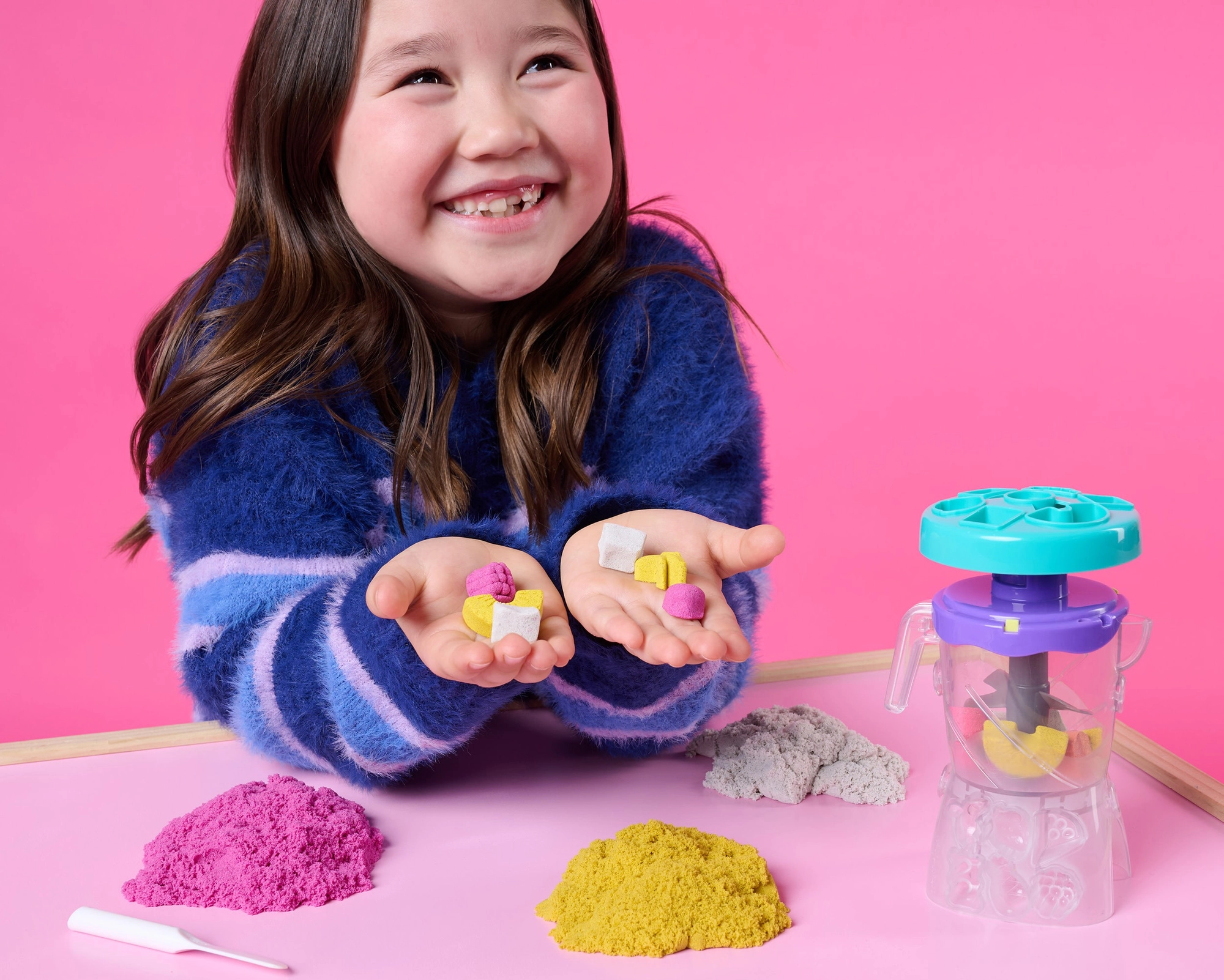 Maak kleurrijke smoothies en ijsdesserts met kinetisch zand met behulp van een handmixer. De set van SPIN MASTER bevat 397 g zand in 3 kleuren, een hand-aangedreven mixer, 18 vormen en accessoires, bekers en ijslollyvormpjes. Kinetisch zand plakt niet aan de handen, behoudt perfect zijn vorm en stimuleert de fijne motoriek en creativiteit van kinderen vanaf 5 jaar.