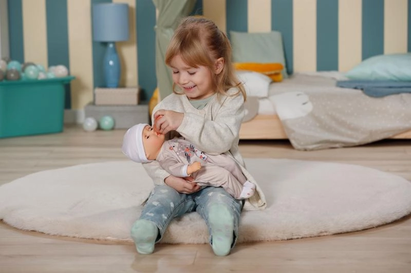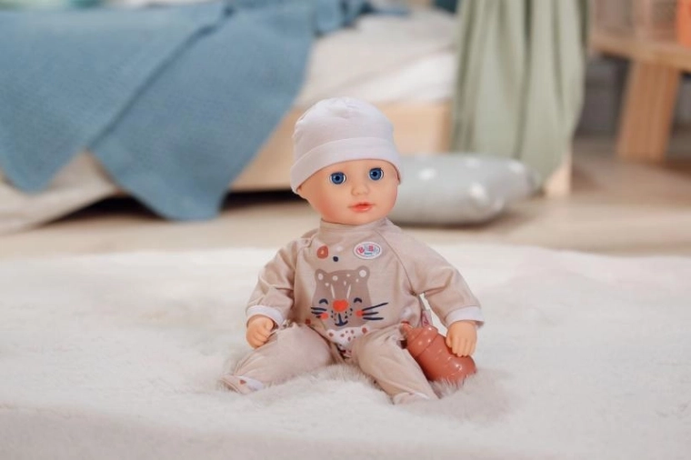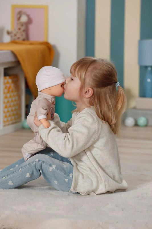De BABY born Anna pop in beige ondersteunt de fijne motoriek, fantasie en verzorgende vaardigheden. Haar zachte lijfje nodigt uit tot knuffelen en samen in slaap vallen, terwijl de slaapogen bij het neerleggen zacht sluiten. De stijlvolle onesie met tijgerprint en het bijpassende mutsje vormen een schattige outfit voor dagelijks speelplezier.