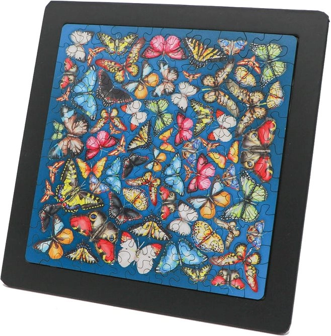 Ontdek dubbel zoveel plezier met de dubbelzijdige houten puzzel Curiosi Double met het thema vlinders. Je krijgt twee afbeeldingen in één, ongewone vormen van stukjes en hoogwaardige houten afwerking voor een lange levensduur. In de verpakking zit ook een praktische lijst voor eenvoudig leggen en tentoonstellen.