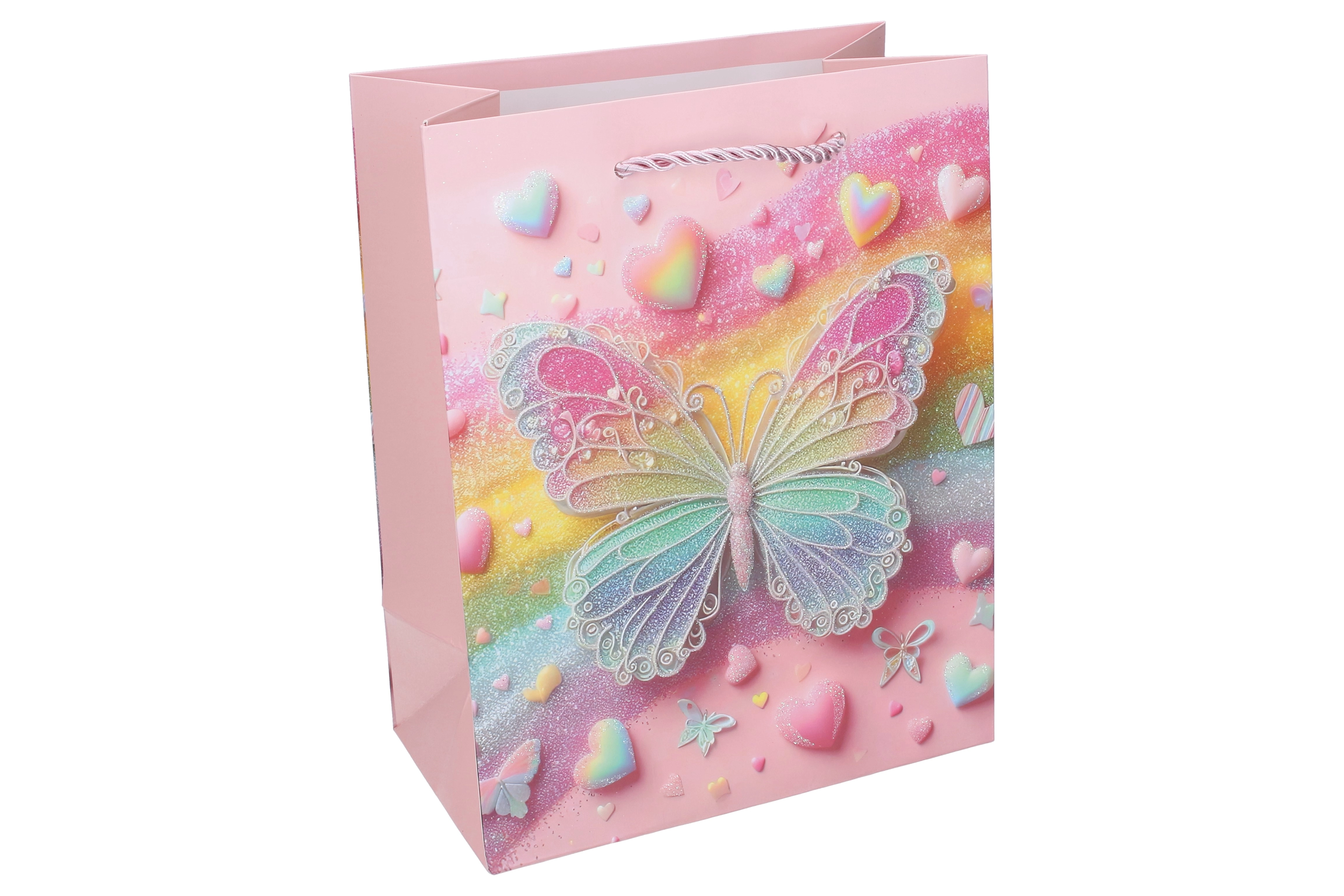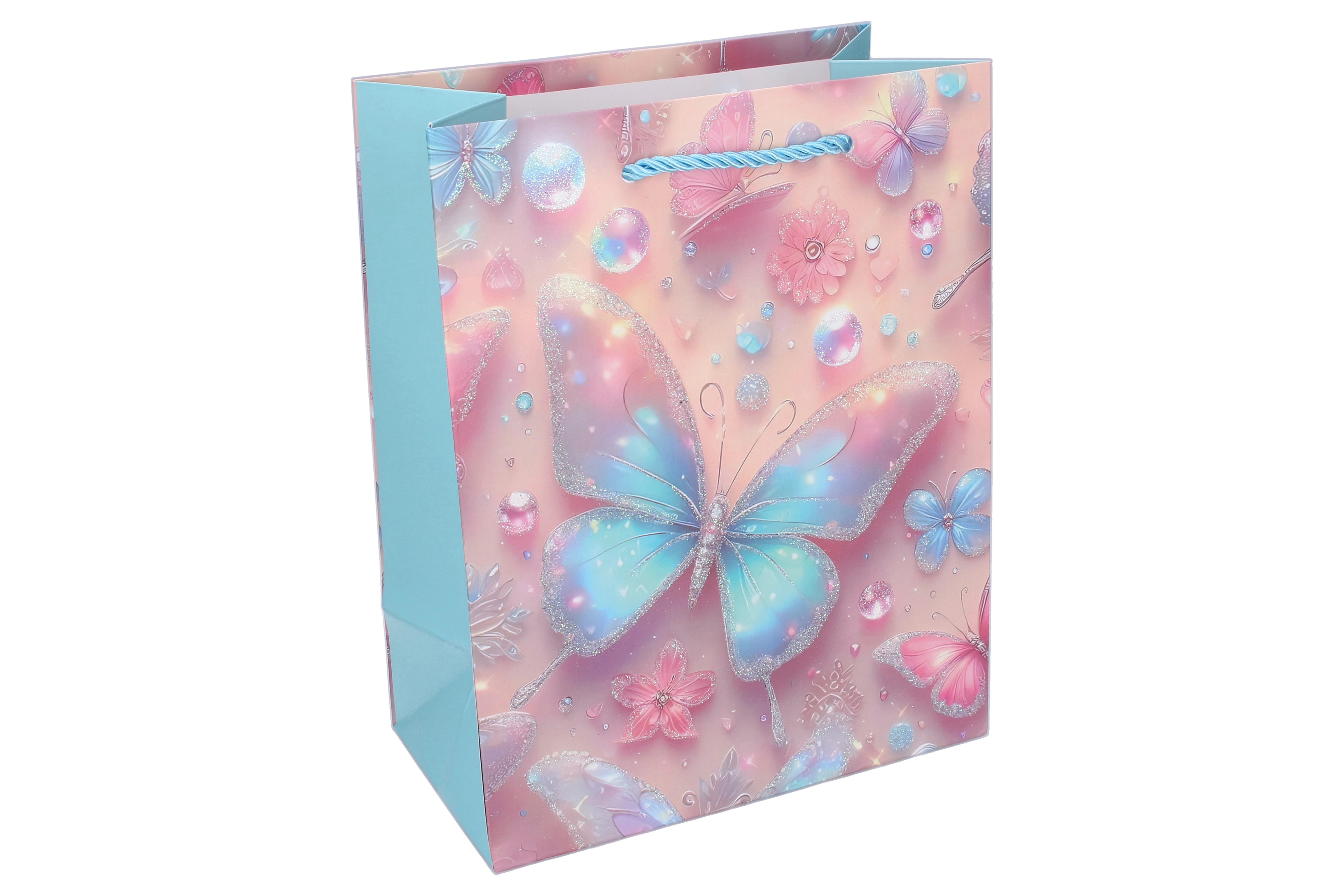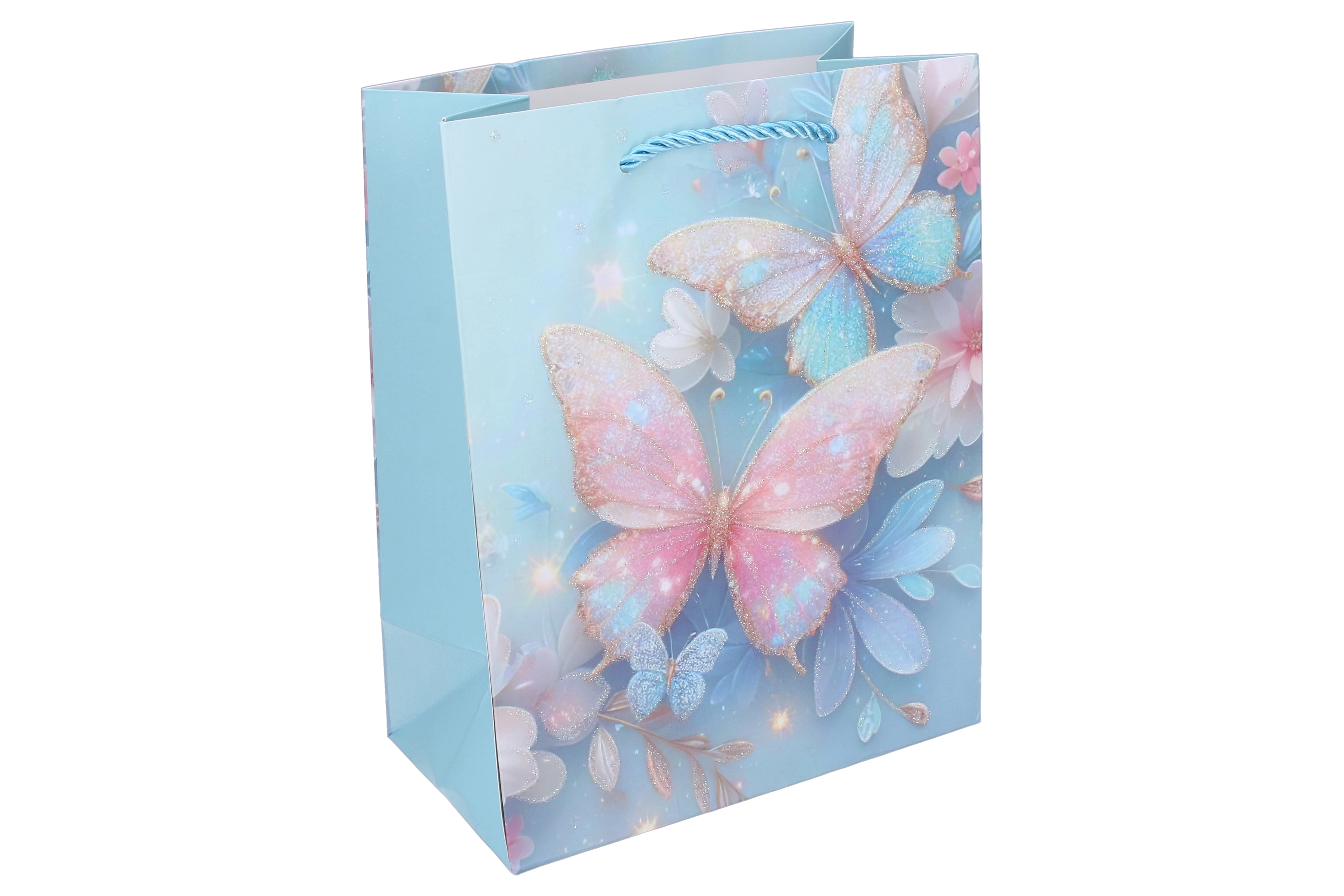 Elegante papieren cadeautas in maat S met subtiele vlindermotieven, ideaal voor het stijlvol verpakken van cadeaus. Voorzien van stevige gedraaide koordhandvatten, glanzende en sprankelende details en een duurzame papieren constructie voor veilig dragen.