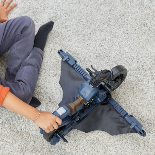 Druk op de knop achter het zadel en zie hoe de Batcycle in een oogwenk verandert in een glider met vleugels voor gedurfde missies boven Gotham.