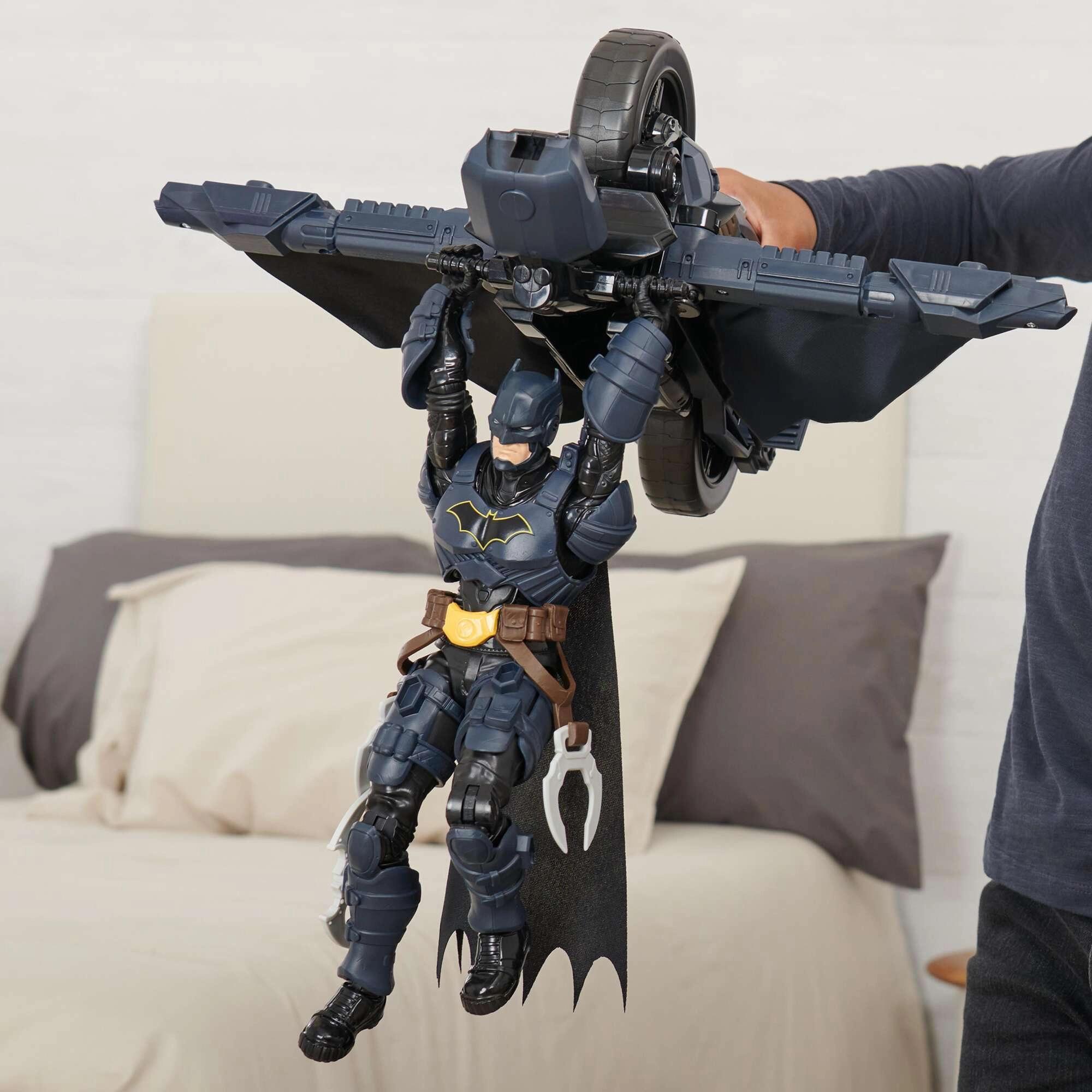 De Batcycle brengt kinderen authentieke superheldenactie. De motor biedt een stabiele zit voor de figuur en een stevige grip op het stuur, zodat rijden en “vliegen” soepel en zeker gaan. Na het indrukken van de knop achter het zadel verandert het voertuig in een glider met vleugels, wat de speelmogelijkheden uitbreidt van achtervolgingen tot gedurfde landingen.