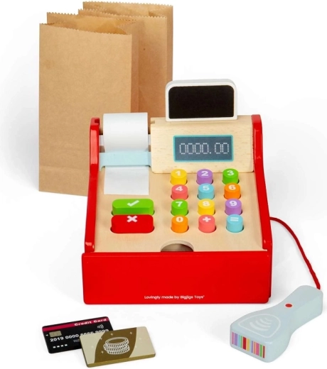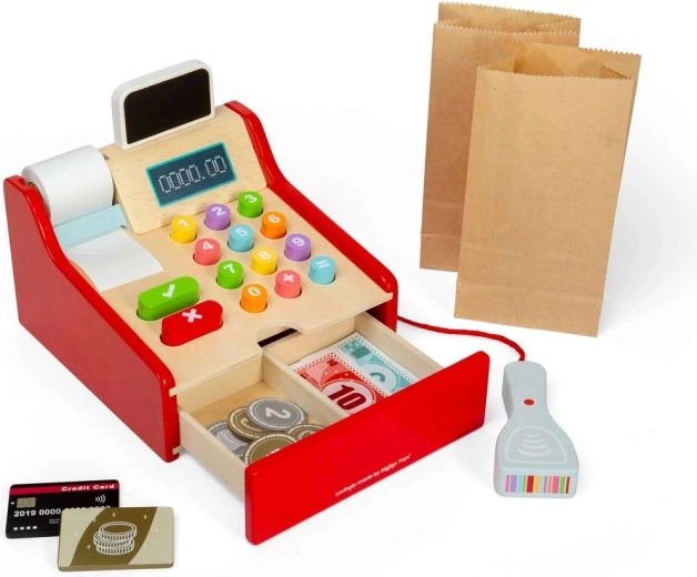 Stijlvolle houten kassa voor kleine verkopers die elke kinderwinkel in een realistische winkel verandert. Kinderen kunnen artikelen scannen, prijzen berekenen, een bon uitgeven en betalen met kaart of contant. Grote knoppen voor kleine handjes, de meegeleverde scanner en accessoires stimuleren rollenspel, de ontwikkeling van communicatie, sociale vaardigheden en financiële geletterdheid. Gemaakt van FSC®-hout – milieuvriendelijk en duurzaam voor dagelijks speelplezier.