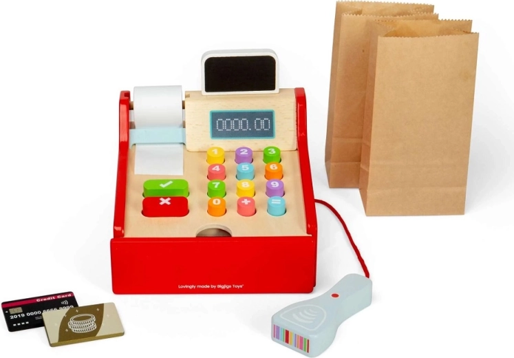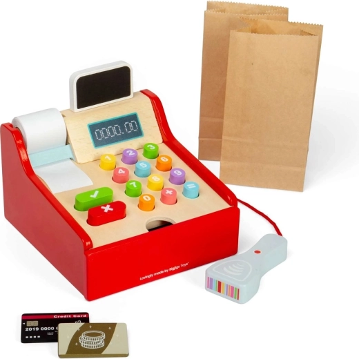 Geef kinderen een authentieke winkelervaring. De houten kassa van BIGJIGS TOYS biedt kleurige, gemakkelijk in te drukken knoppen, een handscanner, ruimte voor bonnetjes en een lade voor “geld”. Realistische elementen prikkelen de fantasie en leiden vanzelf tot het oefenen van rekenen en eenvoudige betalingen.