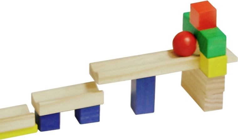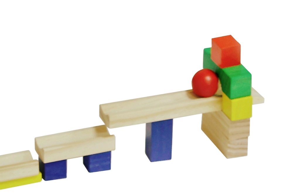 Precisie-geproduceerde houten stenen en een knikker met baan zorgen voor betrouwbaar omvallen en een aantrekkelijk domino-effect zonder haperingen.