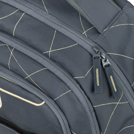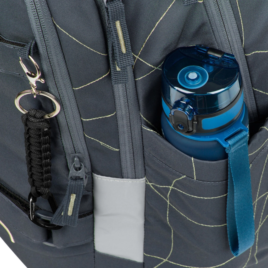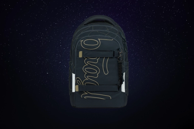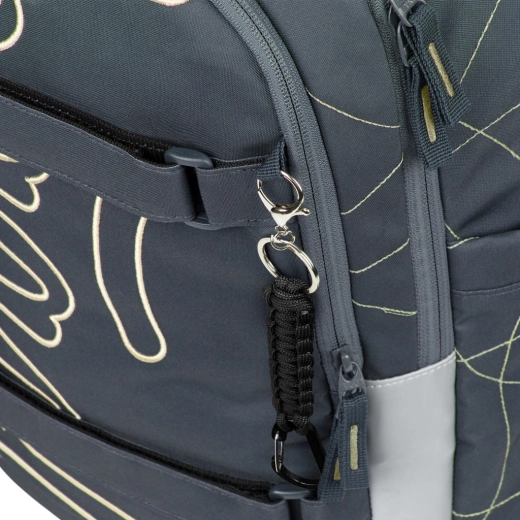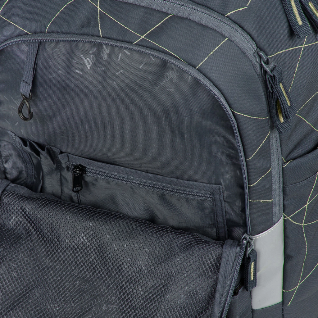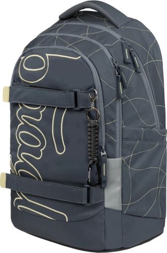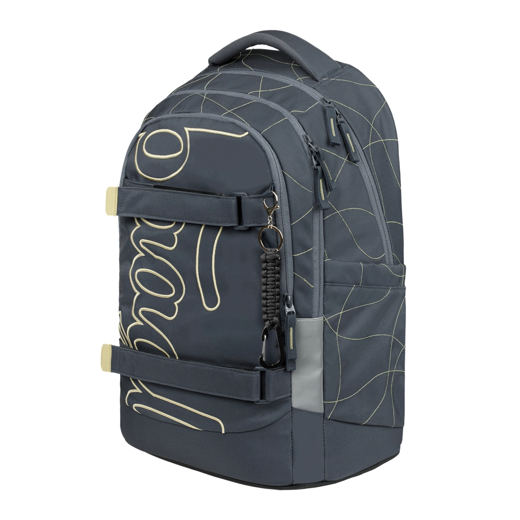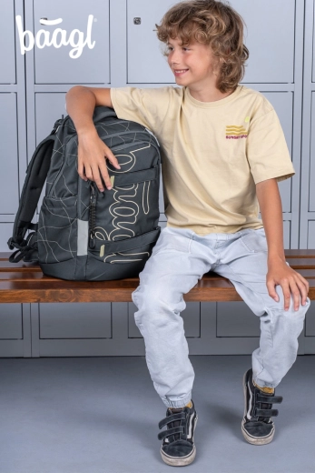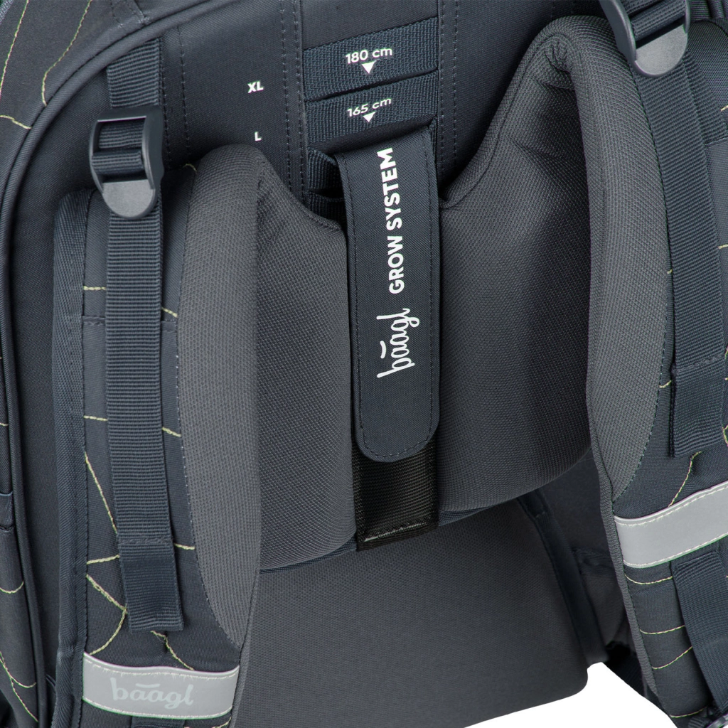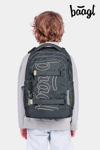 De binnenruimte bestaat uit een driecompartimentenorganizer met een zachte laptopzak, die elektronica beschermt tegen krassen. Stevige zijvakken bieden plaats aan BAAGL Tritan-flessen, de voorste compressiebanden houden een trui of skateboard vast en een stijlvolle hanger geeft de rugzak een eigen uitstraling.