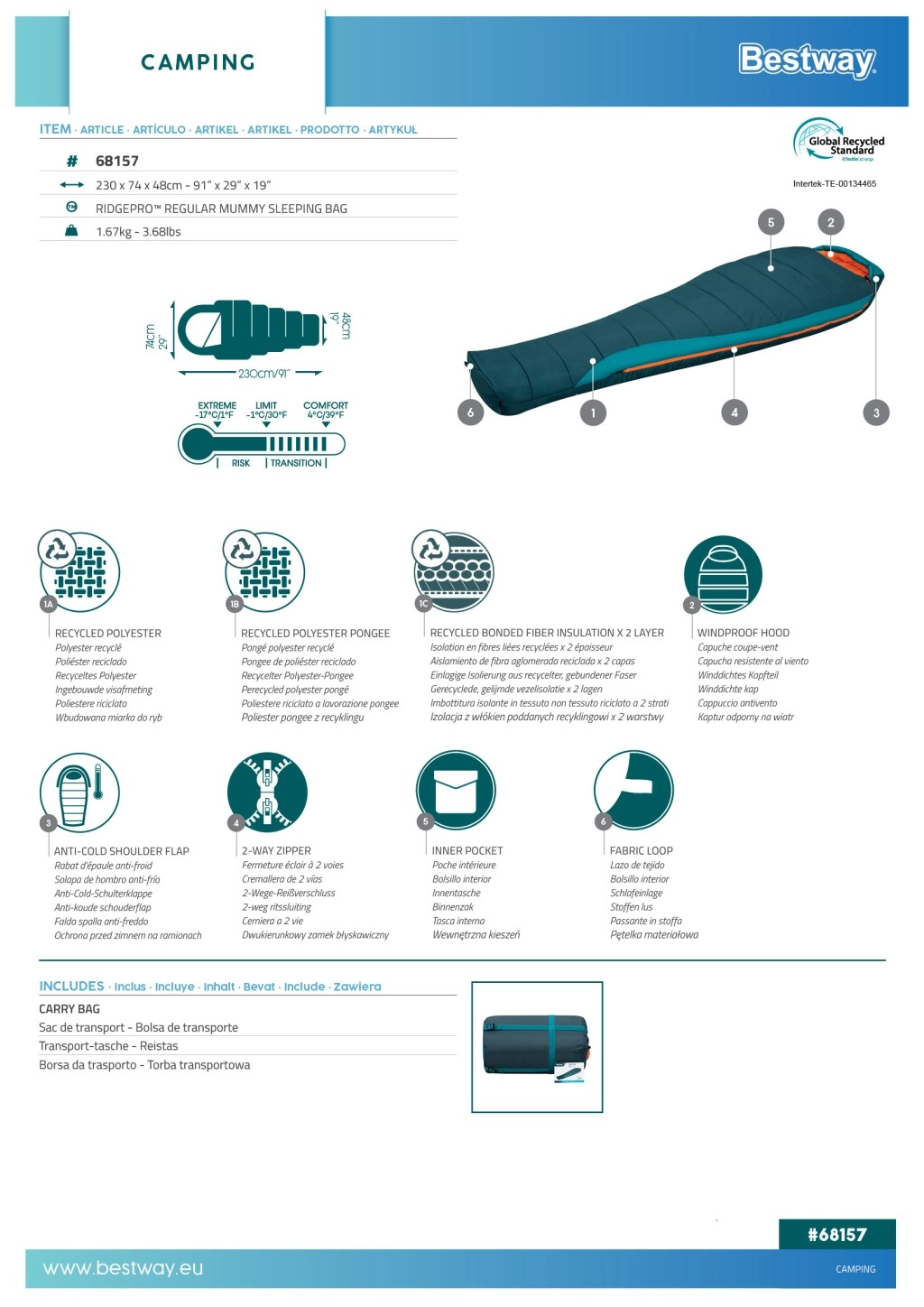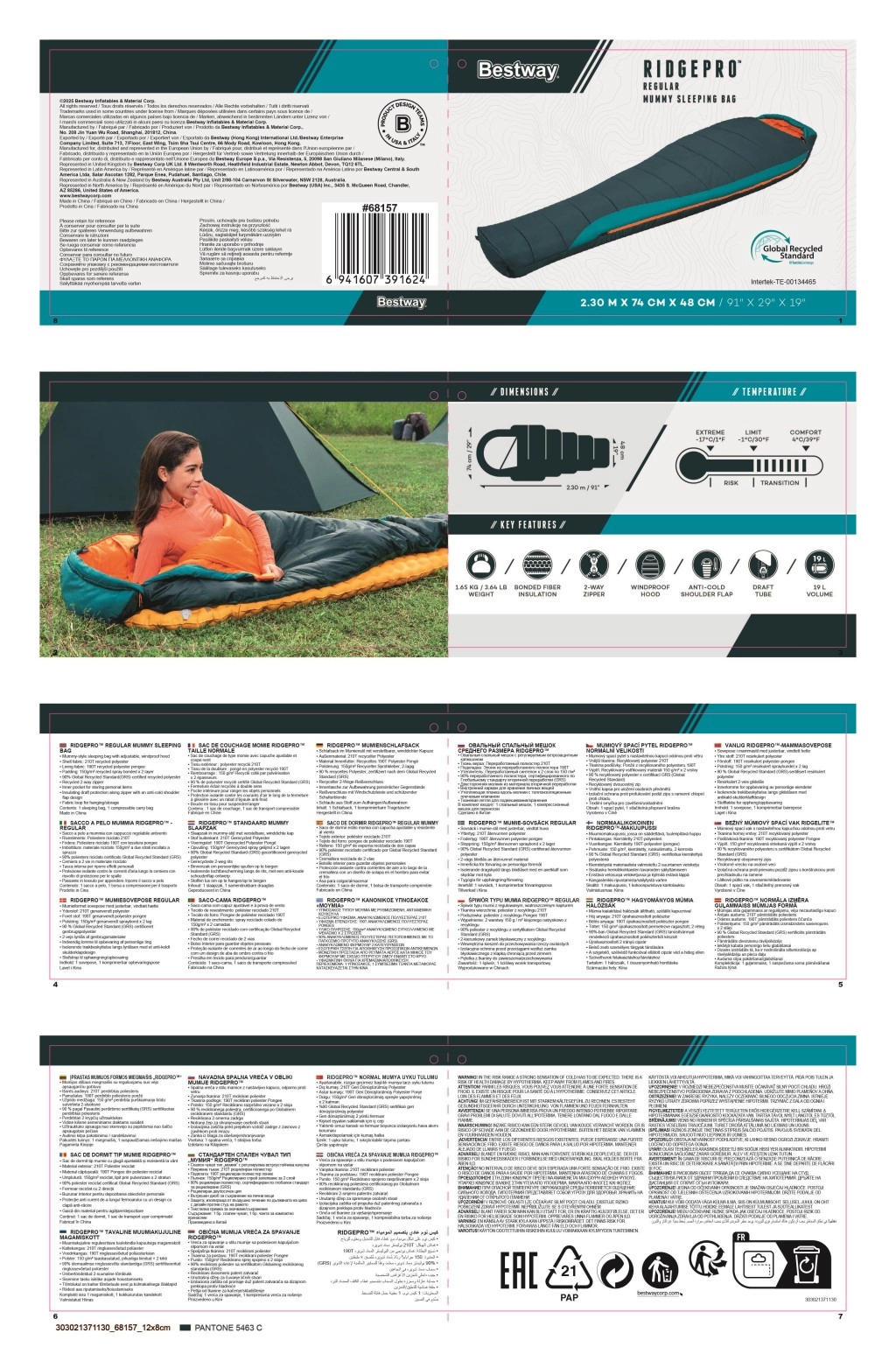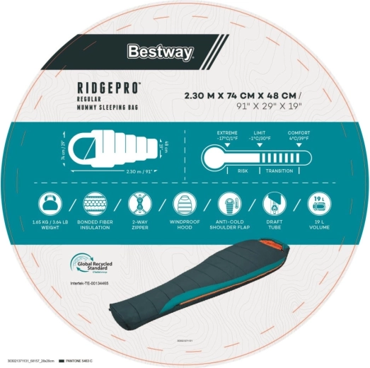 De BESTWAY RidgePro is een mummieslaapzak, ontworpen voor betrouwbare thermische isolatie en comfort van voorjaar tot herfst. De lichaamsomsluitende vorm minimaliseert warmteverlies, terwijl gerecyclede materialen (210T ripstop polyester buiten en 190T pongee binnen) zorgen voor duurzaamheid, een aangenaam gevoel en een lagere ecologische voetafdruk.