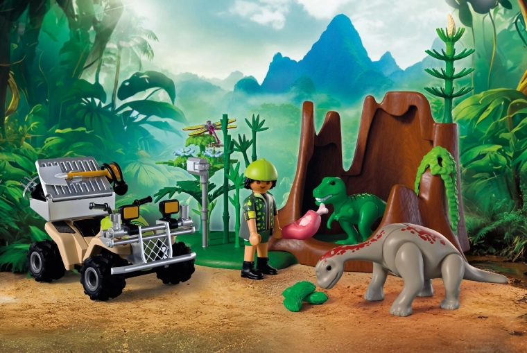 Ga op een avontuurlijke expeditie in de wereld van de dinosaurussen. De onderzoeker doorkruist de weelderige vegetatie op een robuuste quad met opwindbare (pull-back) aandrijving, waar hij verborgen jongen van T‑Rex en Brachiosaurus ontdekt. Met de uitrusting documenteert hij geluiden, legt gedrag vast en voert hij ze met geschikt voer. Dankzij de afneembare transportkist en de opbergruimte voor gereedschap is elke tocht eenvoudig en overzichtelijk.