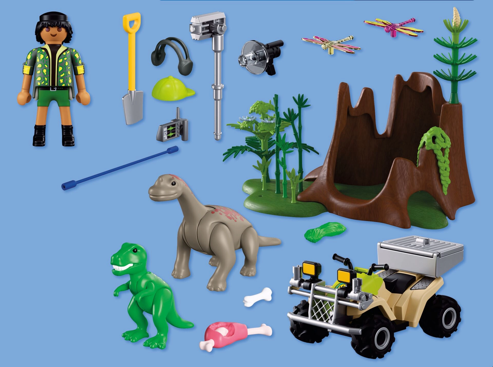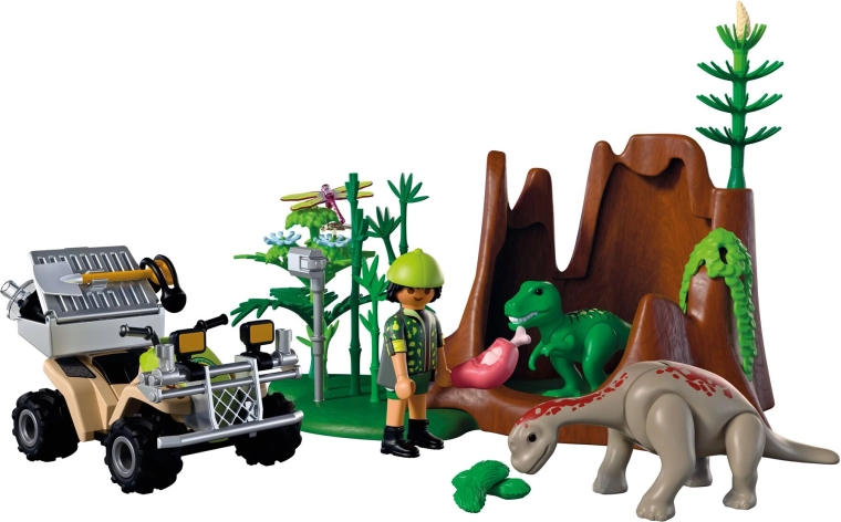 - Figur van onderzoeker (~7,5 cm), quad met pull-back aandrijving, afneembare transportkist, helm met koptelefoon, schepje, richtmicrofoon, camera, boomstronk, basis, 8 kransen van takken, 5 bamboeplanten, 3 bloemen, hangende begroeiing, bot met vlees, bot, 2 graspollen, T‑Rex-jong, Brachiosaurus-jong, 2 libellen