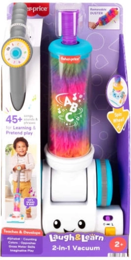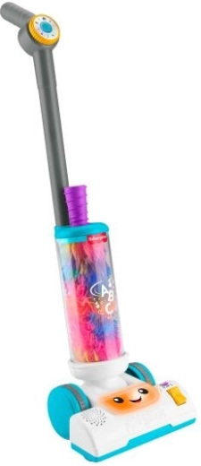 Speelse 2-in-1 kinderspeelgoedstofzuiger van Fisher-Price met licht- en geluidseffecten, afneembare handveger en 2 leerstanden met meer dan 45 melodieën, geluiden en zinnen. Ondersteunt de ontwikkeling van de motoriek, leert het alfabet, kleuren, tellen 1–10 en eenvoudige tegenstellingen en motiveert kinderen tot actieve spel door volwassenen na te doen.
