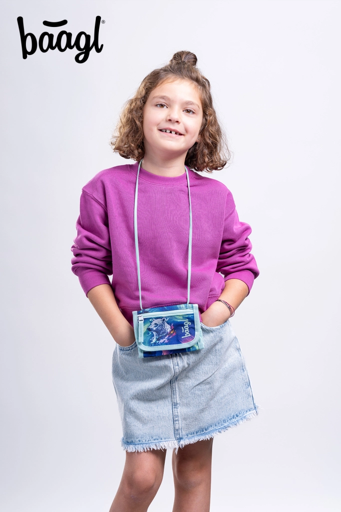 Stijlvolle nektasje van BAAGL met het motief Aurora, biedt veilige opslag voor kleingeld, kaarten en sleutels en comfortabel dragen dankzij de verstelbare koord met veiligheidssluiting. Gemaakt van duurzaam gerecycled materiaal met GRS-certificering, met klittenbandsluiting, een aparte muntzak en een praktische naamlabel voor eenvoudige identificatie.
