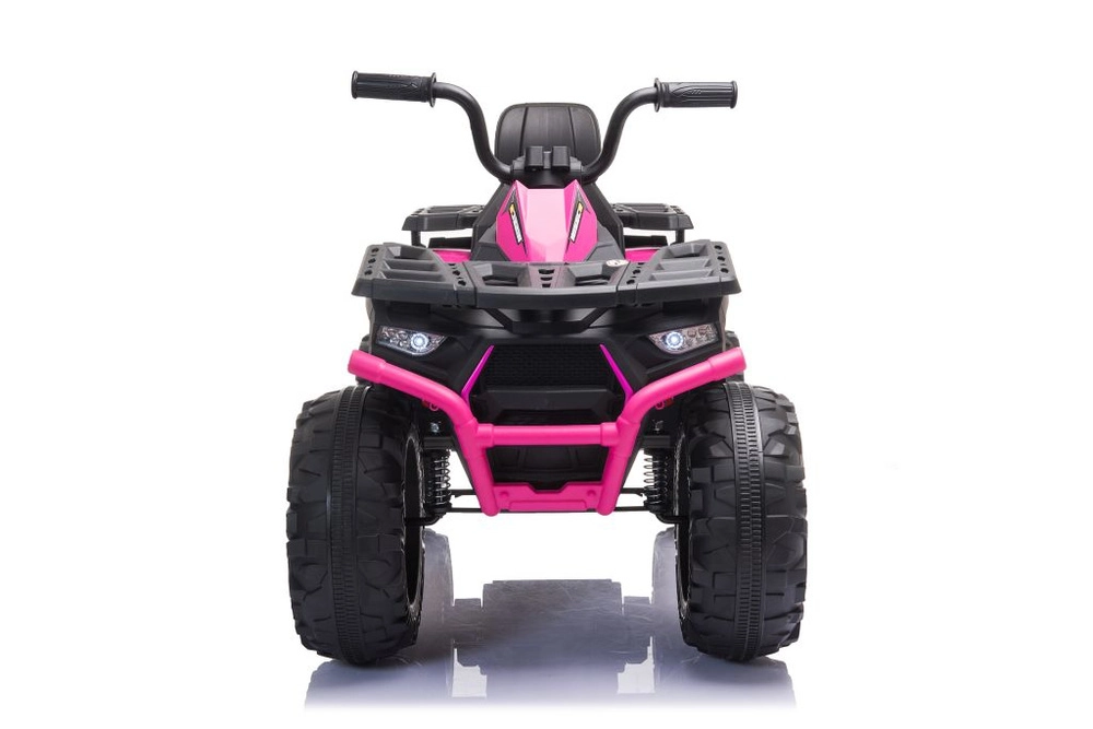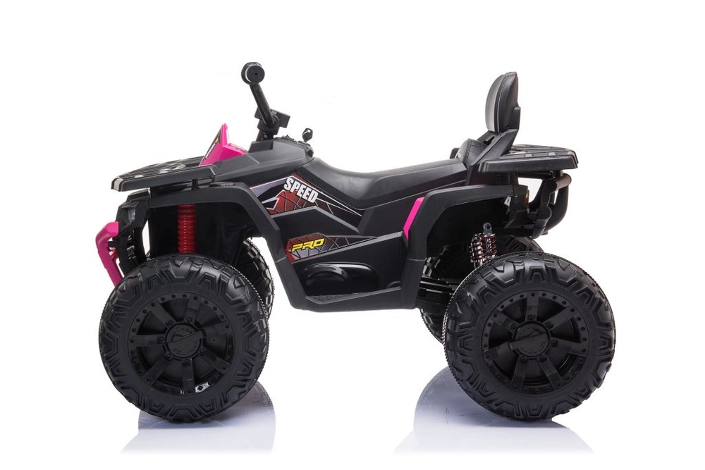 Stijlvolle elektrische kinderquad in roze‑zwarte uitvoering biedt dankzij de grote terreinbanden een stabiele rit, een comfortabele zitting met rugleuning en eenvoudige bediening met het stuur. Een geweldige keuze voor buitenspeelplezier en veilige eerste rijervaringen.