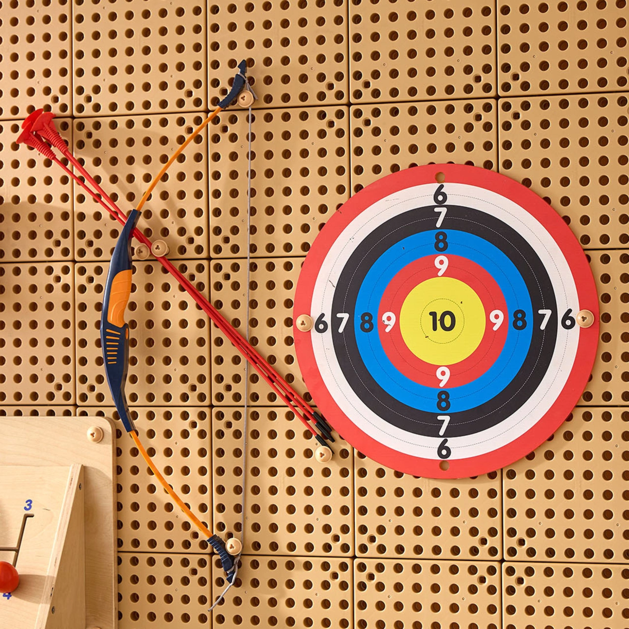 De set is volledig compatibel met STEM-borden en is eenvoudig te bevestigen aan geperforeerde wanden, zodat je snel een slimme speelzone maakt thuis of in de kleuterklas. De lichte kunststof boog is gevormd voor kleine kinderhanden en stimuleert fijne en grove motoriek, oog-handcoördinatie en sociale vaardigheden bij spel met twee of in een klein groepje.