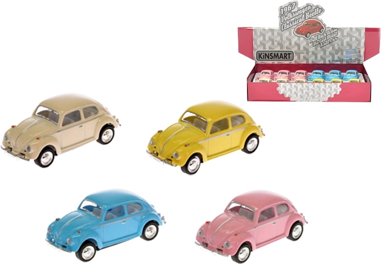 Gedetailleerd uitgewerkt model van de legendarische VOLKSWAGEN BEETLE 1967 in schaal 1:64 voor zowel kleine als grote autofans. Dankzij de metalen constructie, authentieke details en het pull-back mechanisme hoef je het model alleen naar achteren te trekken en het rijdt vanzelf vooruit. Lengte 6,5 cm, pasteltinten en hoogwaardige afwerking maken dit stuk tot een geweldige aanvulling voor spel én collectie.