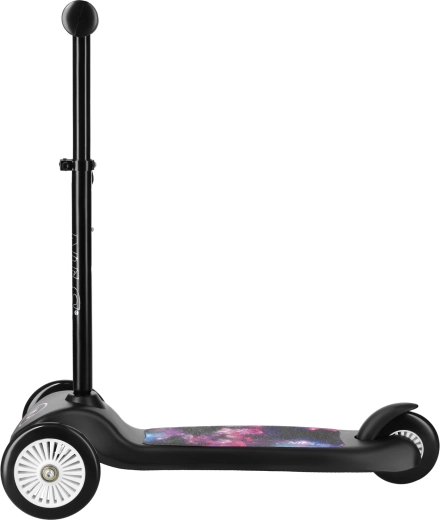 Het dek met een aantrekkelijk galaxymotief, wielen van duurzaam PVC en ABEC 5-lagers zorgen voor een soepele rit op het trottoir en licht oneffen terrein. De robuuste constructie van PP, aluminium en staal draagt tot 50 kg, waardoor de step jaren meegaat. Met een gewicht van slechts 2,1 kg is hij eenvoudig te dragen door zowel kinderen als ouders.