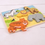 Ontdek een leuke houten inlegpuzzel met safarithema die de vroege ontwikkeling van je kind stimuleert. De puzzel heeft grote, gemakkelijk vast te pakken stukken, waarmee kinderen hun fijne motoriek, zintuiglijke waarneming en concentratie oefenen. De bedrukt basisbord helpt bij het correct toewijzen van vormen en kleuren en verhoogt de educatieve waarde van het spel.