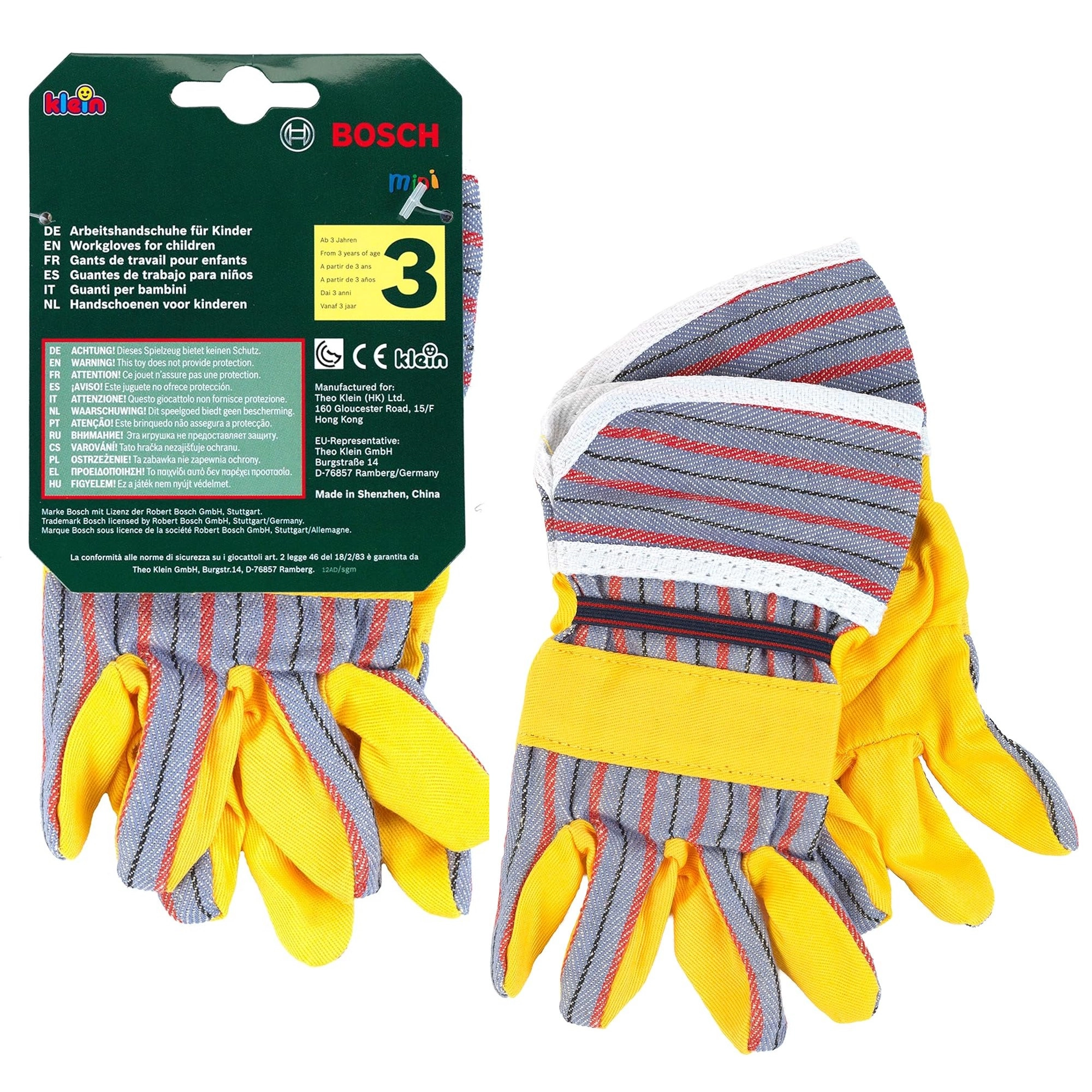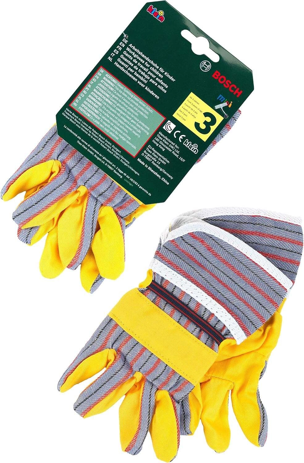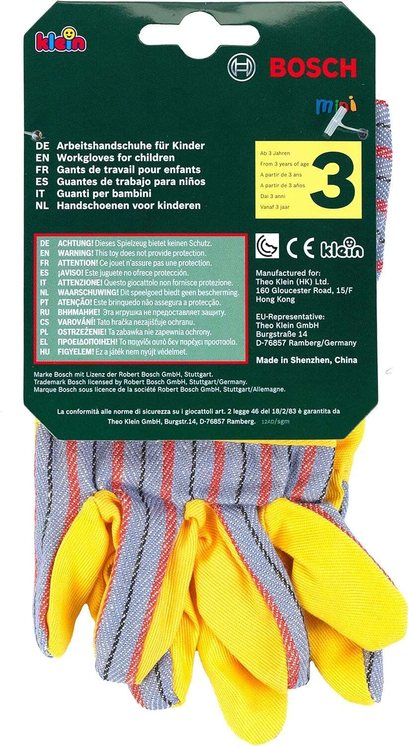 De kinderwerkhandschoenen BOSCH van het merk Klein zijn een geweldige aanvulling voor kleine doe-het-zelvers. Ze bootsen echte handschoenen realistisch na, hebben gele handpalmen met grijze gestreepte accenten, elastische manchetten voor betere grip en zijn ideaal om te spelen als vakman of tuinier.