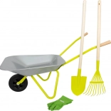 De set bevat een schep, hark en katoenen handschoenen, wat het een ideaal pakket maakt voor kleine tuinhelpers.