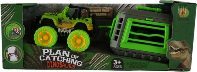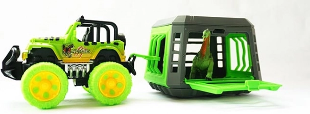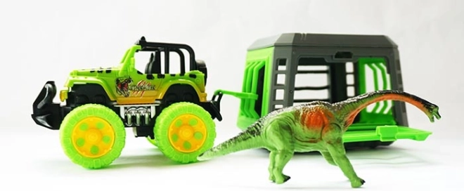 Jeep met aanhanger en dinosaurus van kunststof. De dinosaurus is uitneembaar en de aanhanger is afkoppelbaar.