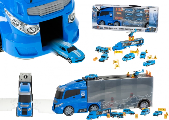De set bevat 6 gedetailleerde metalen politieauto’s en een helikopter, aangevuld met verkeerselementen voor spannende scènes. De transporter biedt plaats aan tot 26 autootjes, dus er is genoeg ruimte voor extra verzamelstukken.