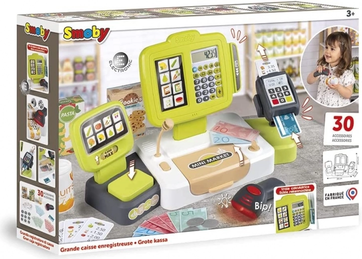 De elektronische kinder kassa van SMOBY biedt realistisch winkels spelen met tal van accessoires. Kinderen kunnen producten wegen, ze met de scanner met licht en geluid “scannen” en betalen met munten, biljetten of kaart. Inclusief een echte rekenmachine met LCD, een te openen geldlade en 30 stuks accessoires voor eindeloos plezier en leren.