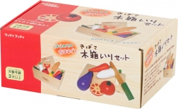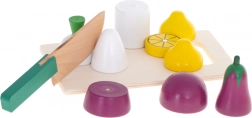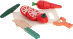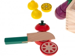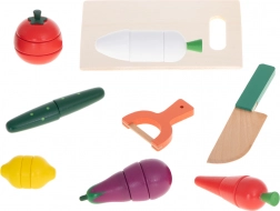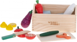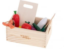 wortel, peterselie (radijs), komkommer, tomaat (inclusief plakjes), citroen, aubergine, snijplank, kindveilige mes, kindveilige dunschiller, houten kistje