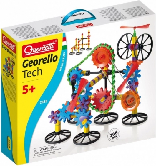 De Georello Tech bouwset draagt rotatiebeweging over tussen ver uit elkaar geplaatste tandwielen en laat duidelijk basismechanische functies zien, vergelijkbaar met die in echte machines. Dankzij de ketting en de elastische riem verbinden kinderen tandwielen over langere afstanden en bouwen ze nog complexere constructies.