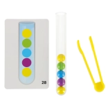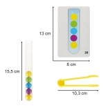 Ontdek een leuke en interactieve manier om de vaardigheden van uw kind te bevorderen met deze grote educatieve set. Het spel richt zich op het sorteren van ballen in de juiste buisjes met behulp van de handen of de bijgeleverde pincetten.