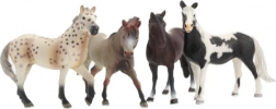 Vier plastic paardenfiguren, elk in een andere kleur, waardoor kinderen verschillende scènes en verhalen kunnen creëren.