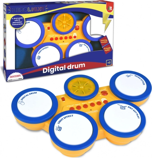 Digitale drums – 4 drums met 12 ingestelde percussie-instrumenten, 6 muziekstijlen (demoliedjes), instelbare snelheid, volumeregeling, ritmische LED-achtergrondverlichting. Werkt op 3× R6/AA 1,5 V batterijen. Afmeting 39×25×6,5 cm.