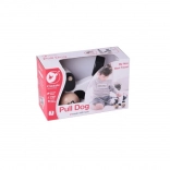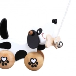 De hond heeft wieltjes met pootafdrukken en zijn staart wiebelt tijdens het bewegen, wat bijdraagt aan zijn speelsheid. Het plezier wordt vergroot door het belletje, dat het gehoor van kinderen stimuleert. Het is uitgerust met een touwtje dat aan een bot in zijn bek is bevestigd, wat gemakkelijk trekken mogelijk maakt. Het speelgoed is geschikt voor zowel binnen als buiten spelen.