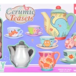 - 4 kopjes met schoteltjes, theepot, melkkannetje, suikerpot, 6 kleuren verf, penseel