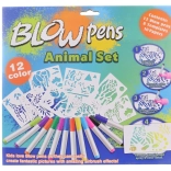 Ontdek creatief plezier met de blaasstiften met het thema safari. De grote set bevat 12 gekleurde stiften, 8 sjablonen, 6 vellen papier, een praktische kartonnen standaard met houder en een blaasopzetstuk met pompje voor eenvoudig en schoon knutselen. Ideaal voor kinderen vanaf 3 jaar.