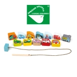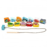 De Cubika rijg voertuigen set bevat 12 houten elementen met verschillende vervoersthema's en één 45 cm lang koord met een houten pin. Kinderen kunnen hun geheugen en behendigheid oefenen en zich vermaken met educatieve spelletjes door middel van de 8 bijgevoegde sjablonen.