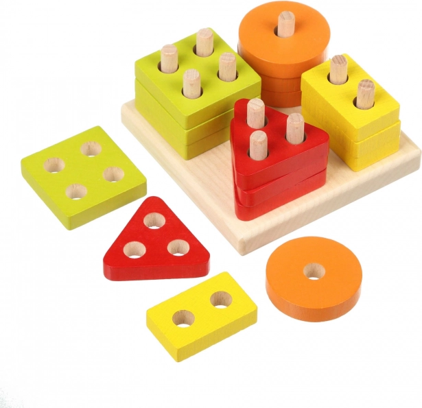 Kleurige cirkels, vierkanten, driehoeken en rechthoeken met gaten worden op de pinnetjes van de basis geplaatst. Kinderen sorteren zo vanzelf op vorm en kleur en trainen hun logisch denken.