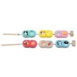 - 12 houten rijgelementen (6 paren), 2 koorden met houten pinnetje en stopper