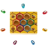 Educatief spel Bijenraat Montessori ondersteunt de ontwikkeling van motorische vaardigheden en de zelfstandigheid van kinderen. Het bestaat uit een massief houten basis en zeven gekleurde bijen die kinderen met behulp van de meegeleverde rode plastic pincet in de bijbehorende openingen plaatsen.