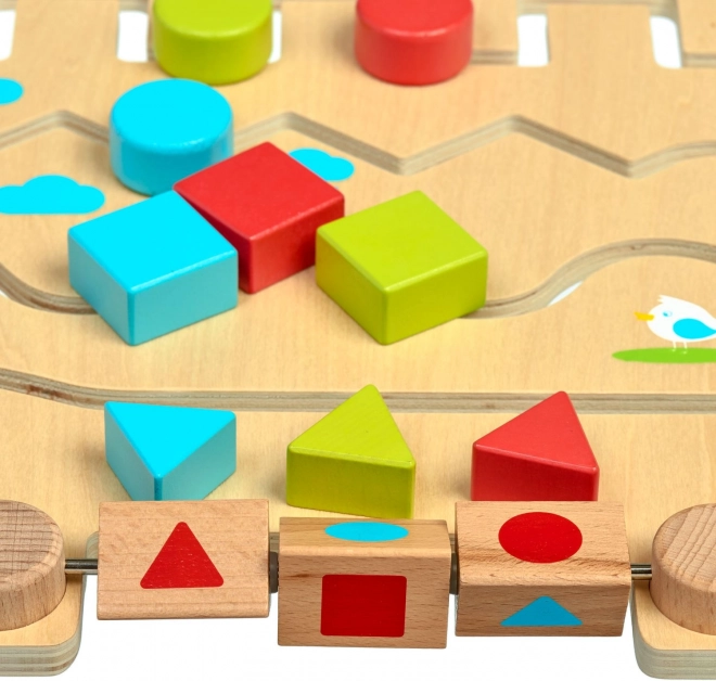 Gekleurde vormen worden over de rails verplaatst zodat ze overeenkomen met het voorbeeld. Kinderen trainen oog-handcoördinatie, concentratie en het stap-voor-stap oplossen van taken.