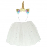 Het betoverende eenhoornkostuum brengt kinderen veel plezier en ruimte voor fantasie. Het lichte tuturokje met sterretjes zwiert mooi mee bij beweging, terwijl de haarband met gouden hoorn en bloemen de hele styling een magische touch geeft.