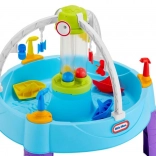 De tafel is uitgerust met verschillende elementen, zoals draaiende doelen en een watercilinder, die kinderen stimuleren tot dynamisch spel en de ontwikkeling van hun vaardigheden.