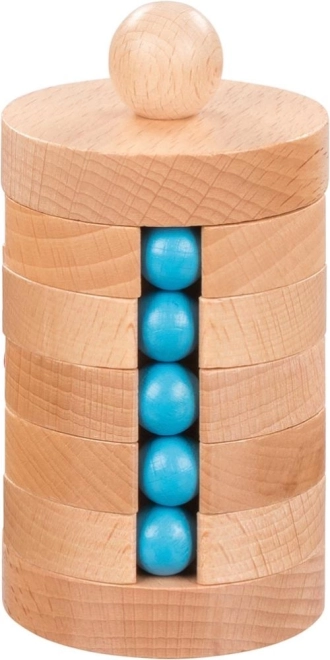 Ontdek een logische uitdaging die zowel vermaakt als ontwikkelt. De Babylonische kogelentoren van GOKI is een houten puzzel in cilindervorm met vijf horizontaal draaibare lagen. In elke laag zitten knikkers in vier kleuren en één vrije positie, waarmee je de knikkers slim kunt verplaatsen. Jouw taak is de kleuren in doorlopende kolommen te rangschikken.