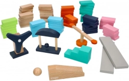 - 120 houten blokjes in 6 kleuren, 3 mechanische elementen (bijv. draaimolen, windmolentje, poort met knikker), 2 brugplaten, 3-traps trapje, startglijbaan met knikker