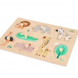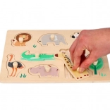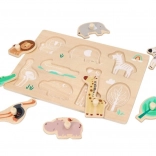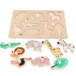 Deze houten puzzel met Safari-thema’s is ideaal voor kinderen vanaf 12 maanden. Elk puzzelstukje staat voor een ander dier, zoals een leeuw, olifant of giraf, wat helpt bij het herkennen van dieren. De puzzel is ontworpen met handgrepen voor eenvoudig vasthouden en hanteren, wat geweldig is voor de ontwikkeling van fijne motoriek bij kleine kinderen.