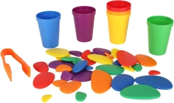 Kleurige steentjes, bekers en taakkaarten begeleiden kinderen van eenvoudige tot meer gevorderde activiteiten: van sorteren op kleur tot optellen en het maken van patronen.