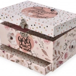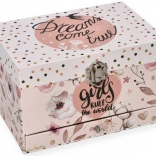 In het onderste gedeelte zit een uitschuiflade voor extra opbergruimte, een veilige metalen sluiting en een duurzaam, lichtgewicht ontwerp dat perfect is voor de kinderkamer. Opschriften in de stijl van “Girls rule the world” en “Dreams come true” zorgen voor een speelse look en prikkelen de fantasie.