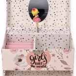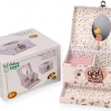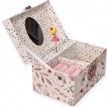 Een schattige sieradendoos met muziekwerk en draaiende ballerina die elke kleine dame blij maakt. Heeft overzichtelijke vakjes, kussentjes voor ringen, een uitschuiflade en een ovaal spiegeltje. Ideaal voor het opbergen van sieraden en kleine spulletjes en als prachtige kamerdecoratie.